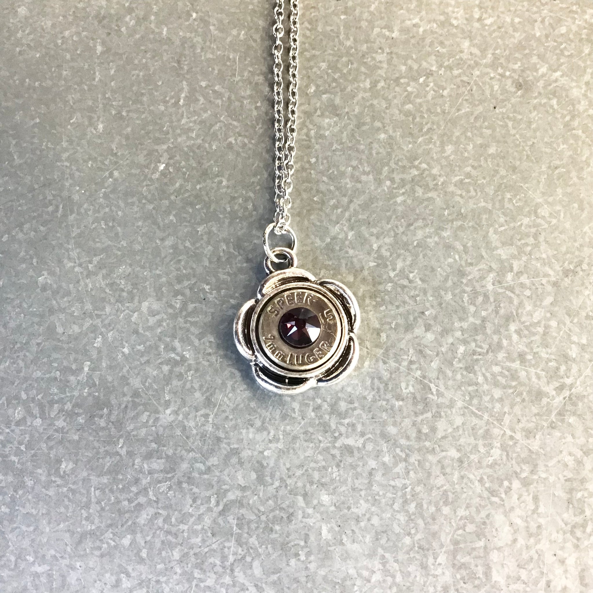 Beautiful jewelry made with old bullets! Bullet has purple sparkly crystal in the center.